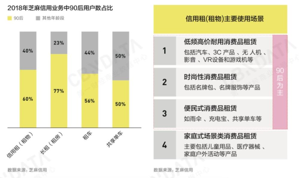 值得注意的是,不同于传统租赁经济,“信用租赁”通过芝麻信用“免押”模式,赋能商家,降低年轻人体验全新生活方式的门槛。在使用芝麻信用免押租物、租房、租车的用户中,90后占比均超过50%。