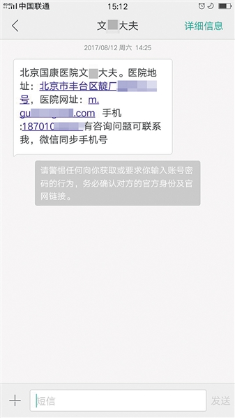 今年7月底,他在网上咨询过北京京军医院,并留下了自己的联系方式。
