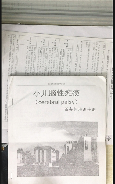 在公司内新京报记者找到一本“小儿脑性瘫痪”的话务部培训手册,手册上标注:北京京军脑瘫病医学研究院咨询部制。