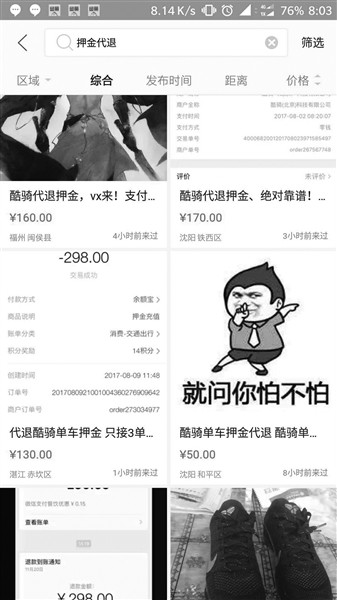 记者在某二手交易平台上看到有“代退黄牛”,大部分是退“酷奇单车”押金的,收费从30-180元不等。商家称,只要提供注册账号时所用的手机号、姓名、身份证号、照片等信息,就可以帮忙退押金。记者仔细翻看了几十条代退信息,选择了一家好评度相对较高的,留言询问。过了很久商家才回复记者,目前只能退酷奇单车的押金,因为目前只有酷奇的营业点还在排队退款。不过在商家提出要加记者微信才能办理业务时,记者选择了拒绝。