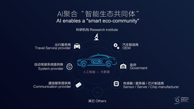人工智能还有一个和过去互联网不一样的地方,就是它有强大的垂直整合的特点,或者用我们这次会议的主题来说,就是网络空间的命运共同体。以前,互联网公司基本上是以软件为主的,但是今天,软件、硬件、服务,这三者要进行强有力的结合才能真正发挥出它们的效果。以汽车工业为例,汽车工业是一个上百年的产业,但是今天因为人工智能技术的发展,它发生了巨大的变化,这个变化不仅仅会影响车厂,而且会影响很多上下游的产业。无论是打车服务的提供商,还是芯片制造商,像英特尔、英伟达,或者是Tier 1供应商,像博世、大陆,再到整车厂商,中国有200多家整车厂商,国外有福特、戴姆勒也都加入了百度Apollo开放平台。上下游的很多公司、很多领域,都会从中受益,或者说也都会受到人工智能技术发展的威胁。汽车是一个非常大的产业,在中国大概占到了GDP的六分之一,这样的一个产业,在百年不变的情况下,未来几年会发生巨大的变化。可想而知,人工智能技术对于实体经济、对于各行各业的推动是显而易见的。其实,我只是用汽车作为一个例子,我们能够想到的每一个行业,都会因为技术的创新而改变,都会因为人工智能技术的不断演进而改变,从房产到教育、医疗、物流、能源等等,我们可以想到的产业都会因为人工智能的技术而发生不断地变化。