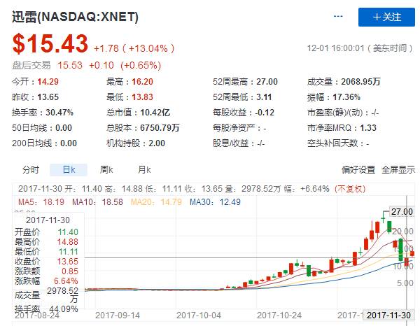 此前数天,迅雷和大数据公司掀起多轮“口水战”。双方互相指责,导致迅雷美股大跌逾40%。最低价报11.11美元/股。随后两天开始反弹,11月30日,迅雷涨6.64%。12月1日,迅雷涨13.04%,报15.43美元/股。总市值10.42亿美元。