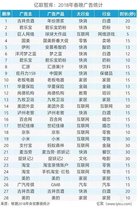 从行业内部看,互联网内有大零售(淘宝、支付宝、京东、美团、小米),婚恋(世纪佳缘、百合网),网游(球球大作战);快消行业内部有白酒(古井贡酒、泸州老窖、梦之蓝),饮料(安慕希、君乐宝、汇源),保健品(佐丹力159)。