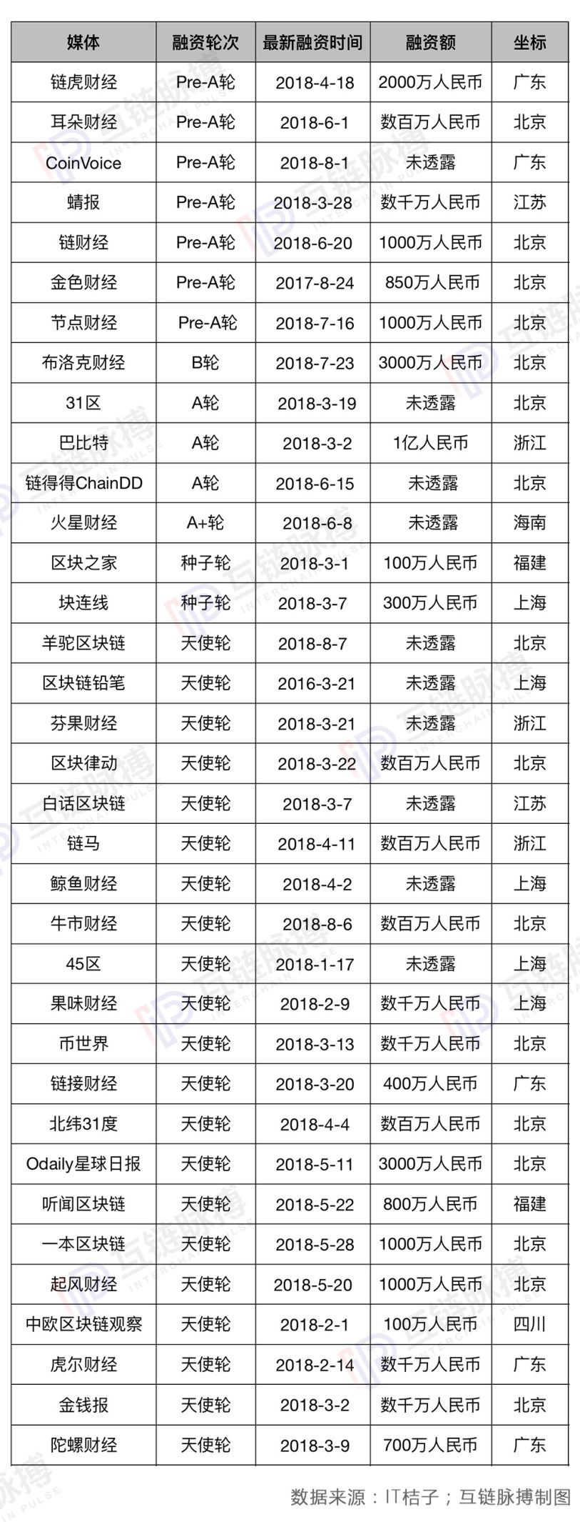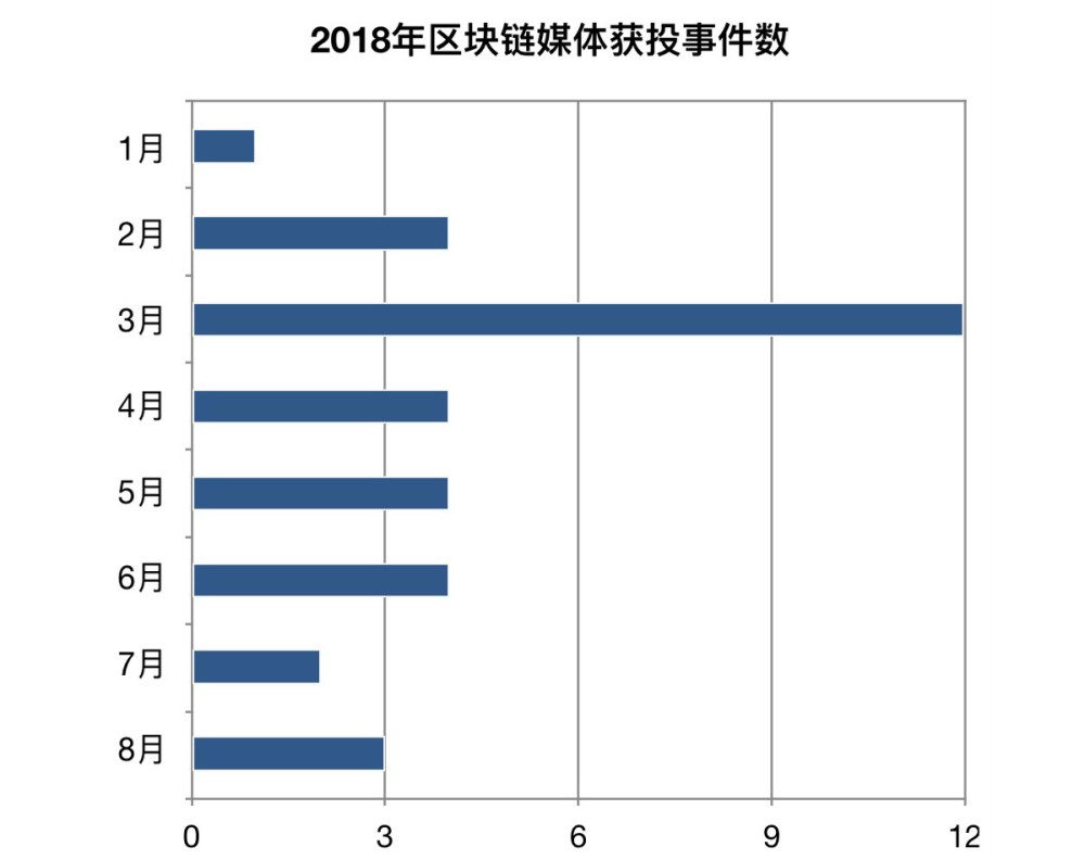 另据IT桔子数据,互链脉搏梳理了所有获投的区块链媒体项目(附录一)。排除今年以前融资的金色财经和铅笔区块链,今年共34起区块链媒体融资事件。资本热捧出现在3月,共12起。第一季度的融资事件占今年以来的一半,第二季度下降至35%,而7月、8月两月共占15%;随着“三点钟”社群的吸睛度降低,融资动作也在逐步减少。此外,获投项目大多停留在天使轮(22件,占61%),目前在融资上跑得最远的只有一家,达到B轮。