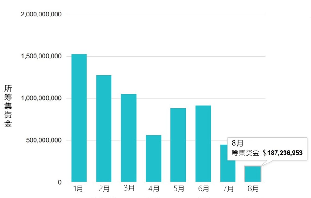 根据ICOdata数据显示,七月、八月融资额降至全年最低。具体数据为,今年一季度的融资体量均在10亿以上:一月最高,达15.2亿美元,二月12.7亿美元,三月10.5亿美元;二季度ICO融资相较第一季度减少61.7%,明显掉了一个档,居于5亿~10亿之间:四月5.6亿美元,五月8.8亿美元,六月9.1亿美元。进入今年下半场,ICO成绩愈加难看:七月4.5亿美元,截止发稿时间,八月才筹得1.9亿美元,而整月下来估计在2亿美元上下。