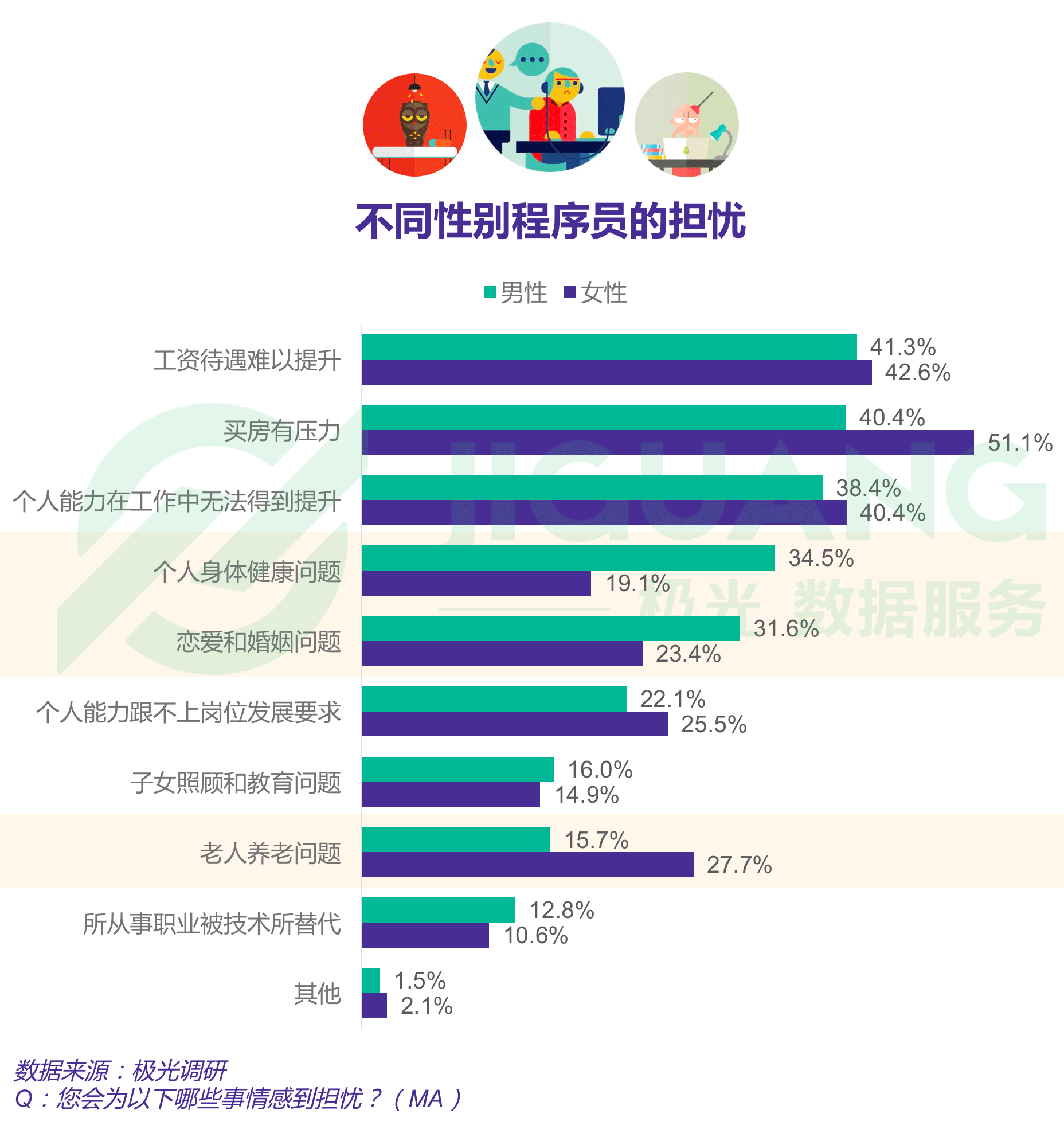 ? 51.1%的受访女性程序员担心买房压力,同时对个人能力的提升、老人养老以及工资待遇都表现出比男性程序员更大的压力