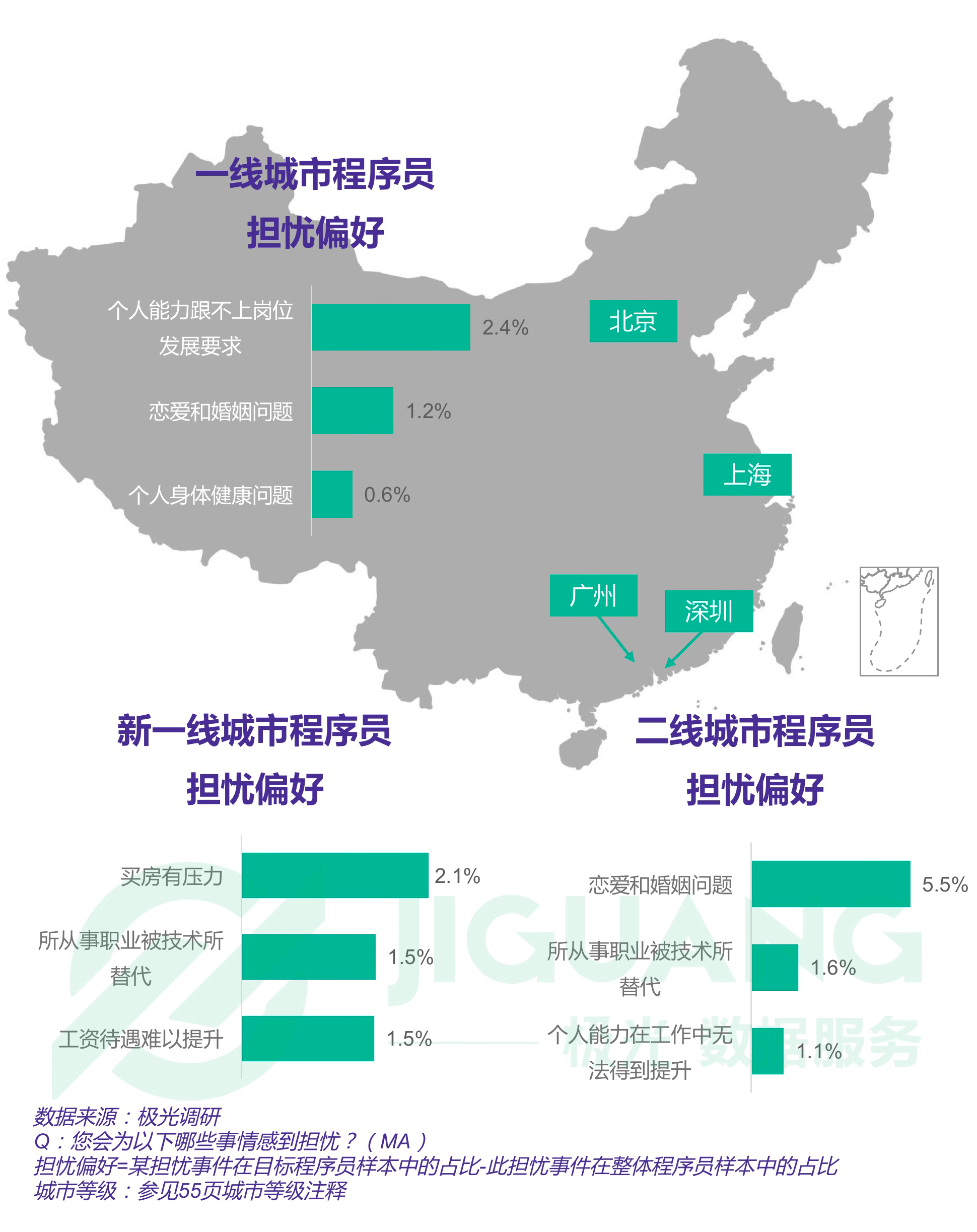 ? 相比整体受访程序员,一线城市程序员更为担忧个人能力跟不上岗位发展要求,新一线最关注买房压力,二线城市程序员更为担心恋爱和婚姻问题