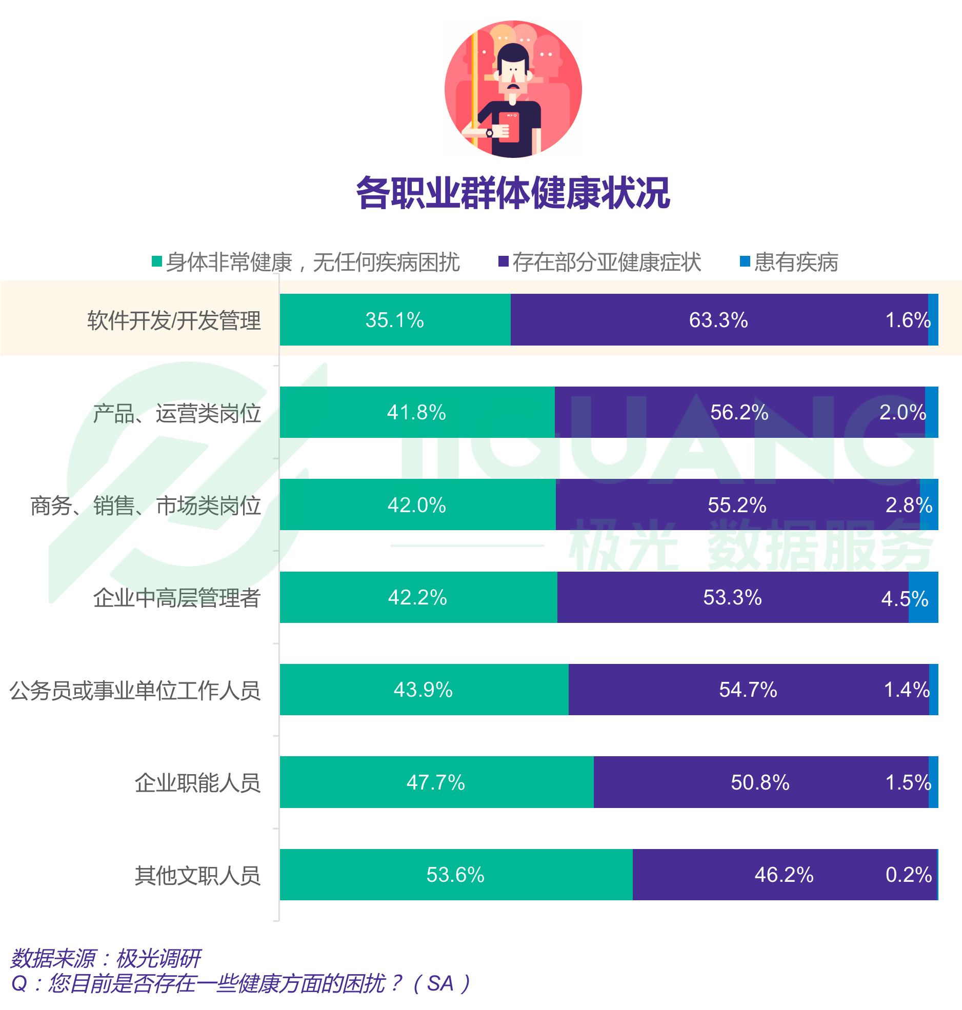 ? 63.3%的受访程序员目前存在部分亚健康症状,仅35.1%程序员认为自己身体健康无任何疾病困扰,相比其他职业,程序员可谓是不折不扣的“健康难民”