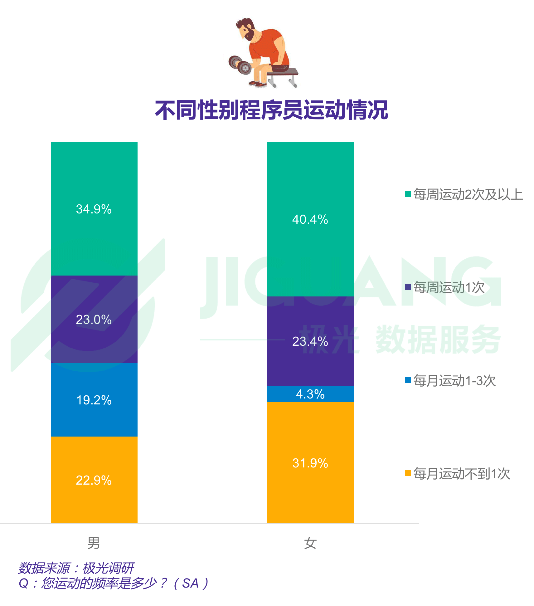 ? 女性程序员中,40.4%每周运动2次以上,但也有31.9%每月运动不到1次