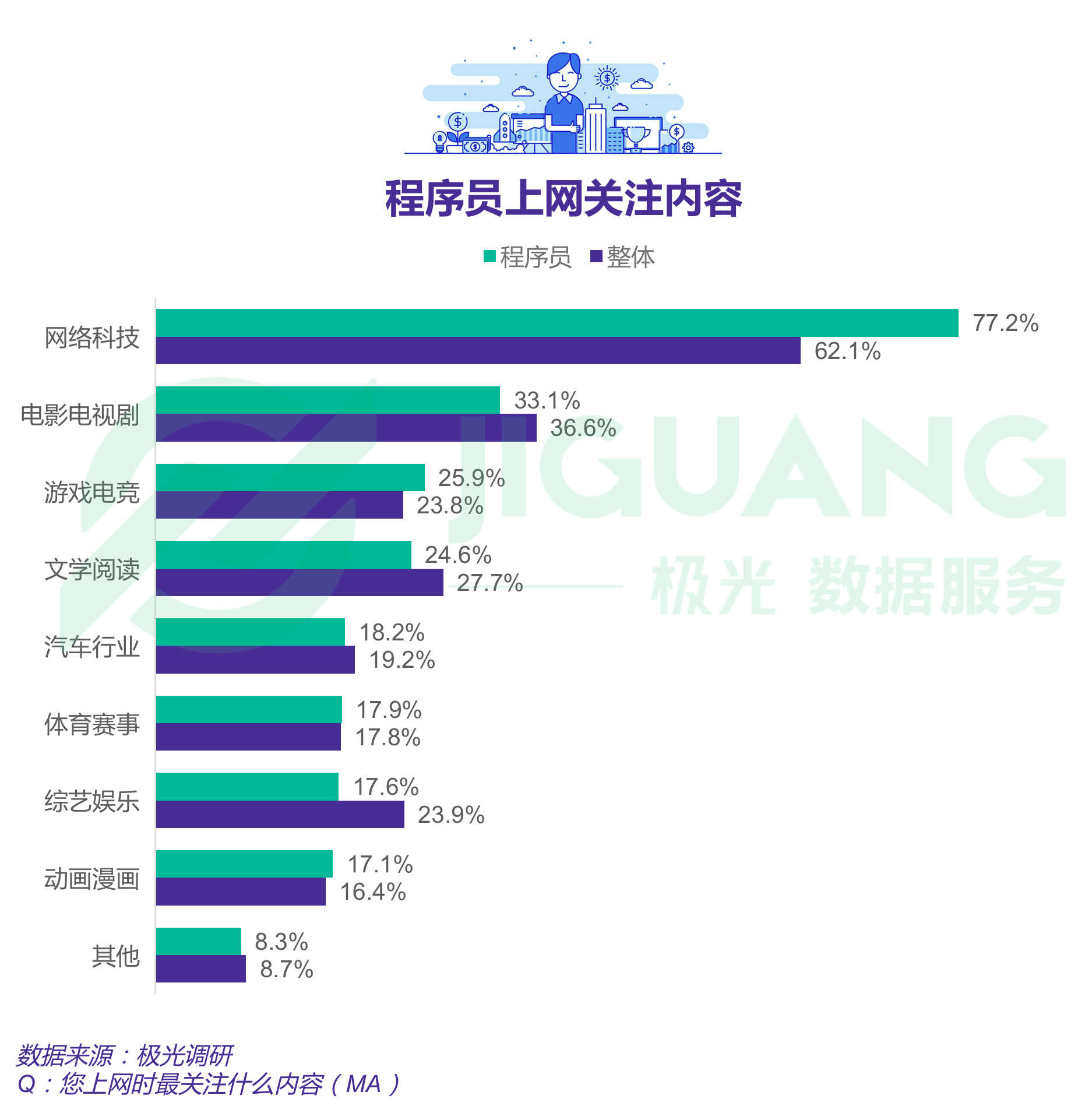 ? 紧跟科技潮流,走在技术前端,77.2%的程序员上网关注网络科技内容