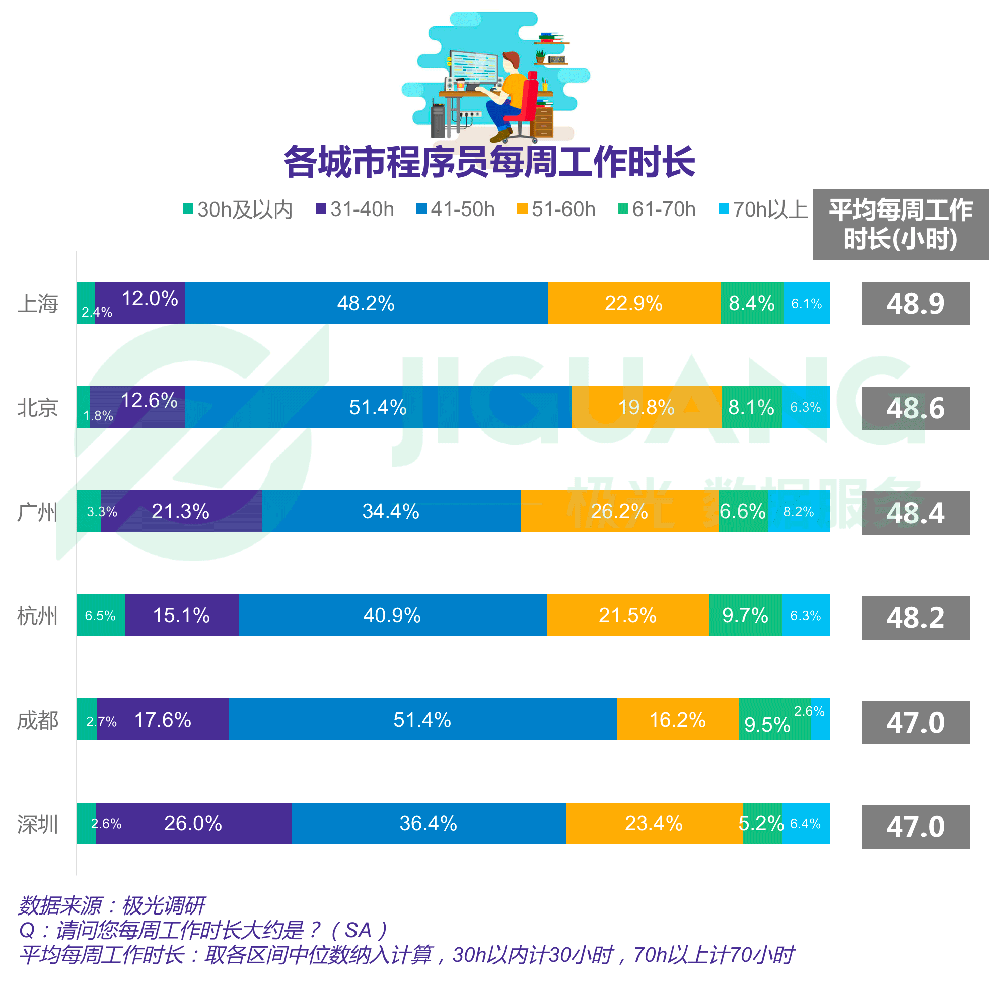 ? 深圳程序员较闲,平均每周工作时长为47.0小时,28.6%每周工作时长在40小时及以内