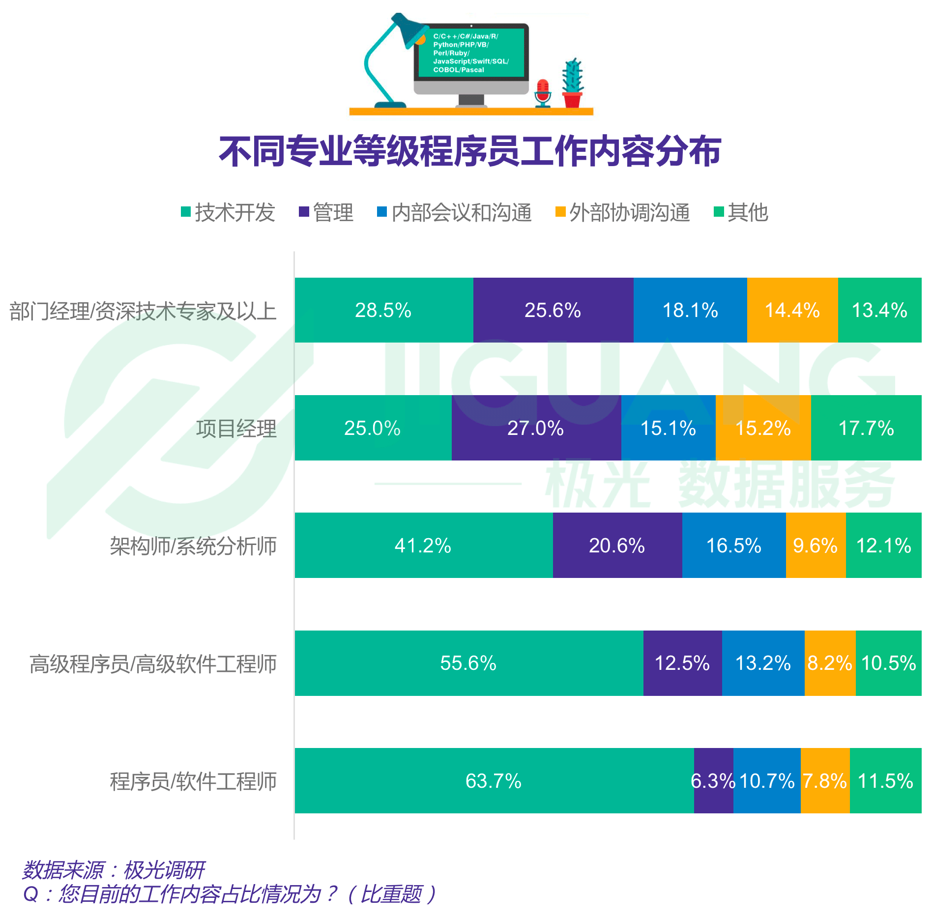 ? 对于管理专业等级的程序员,内外部沟通协调工作更重,内外部会议和沟通在项目经理工作中占比30.3%,在部门经理/资深技术专家及以上中占32.5%