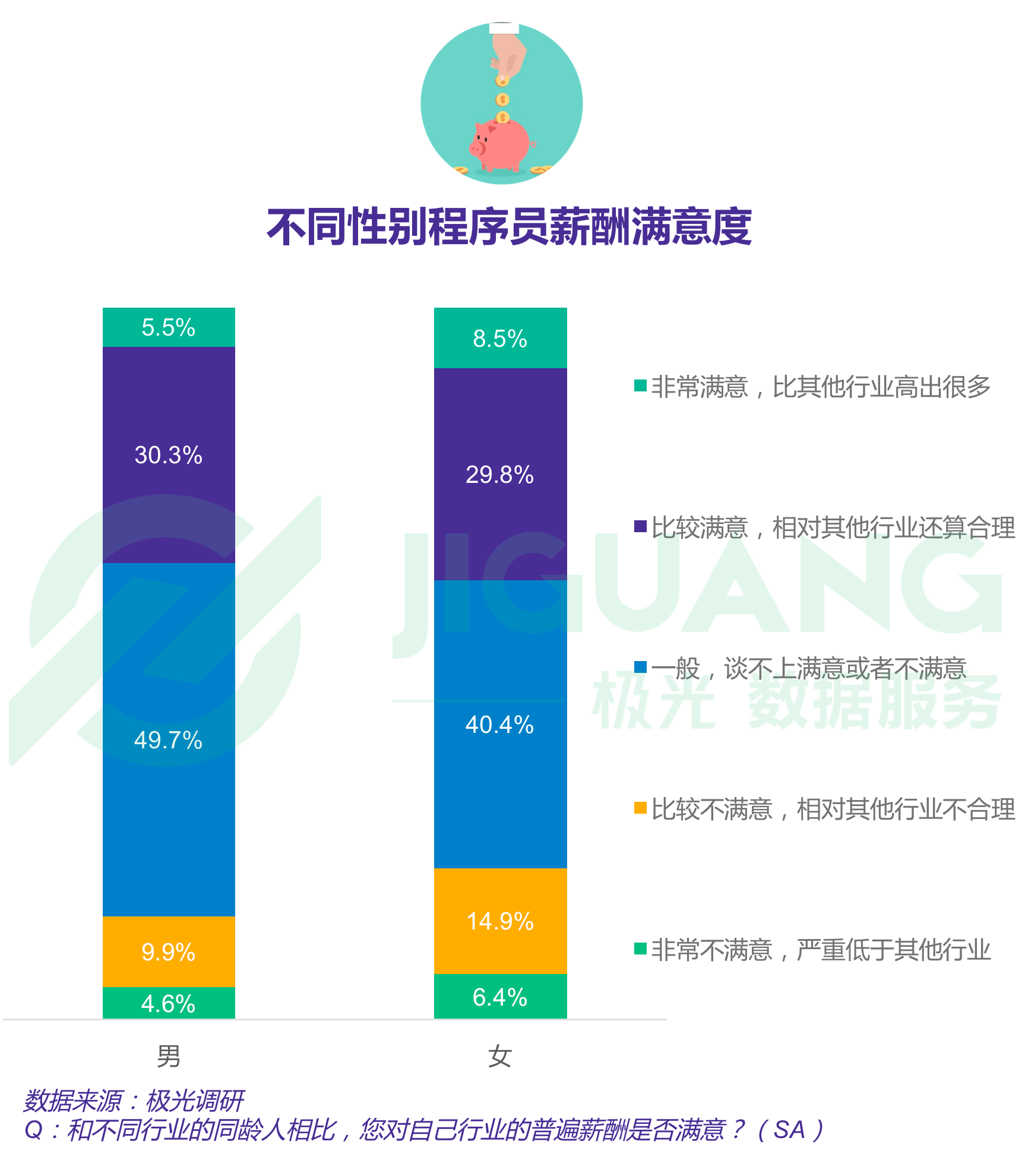 女性程序员对行业薪酬非常满意和非常不满意的比例都高于男性