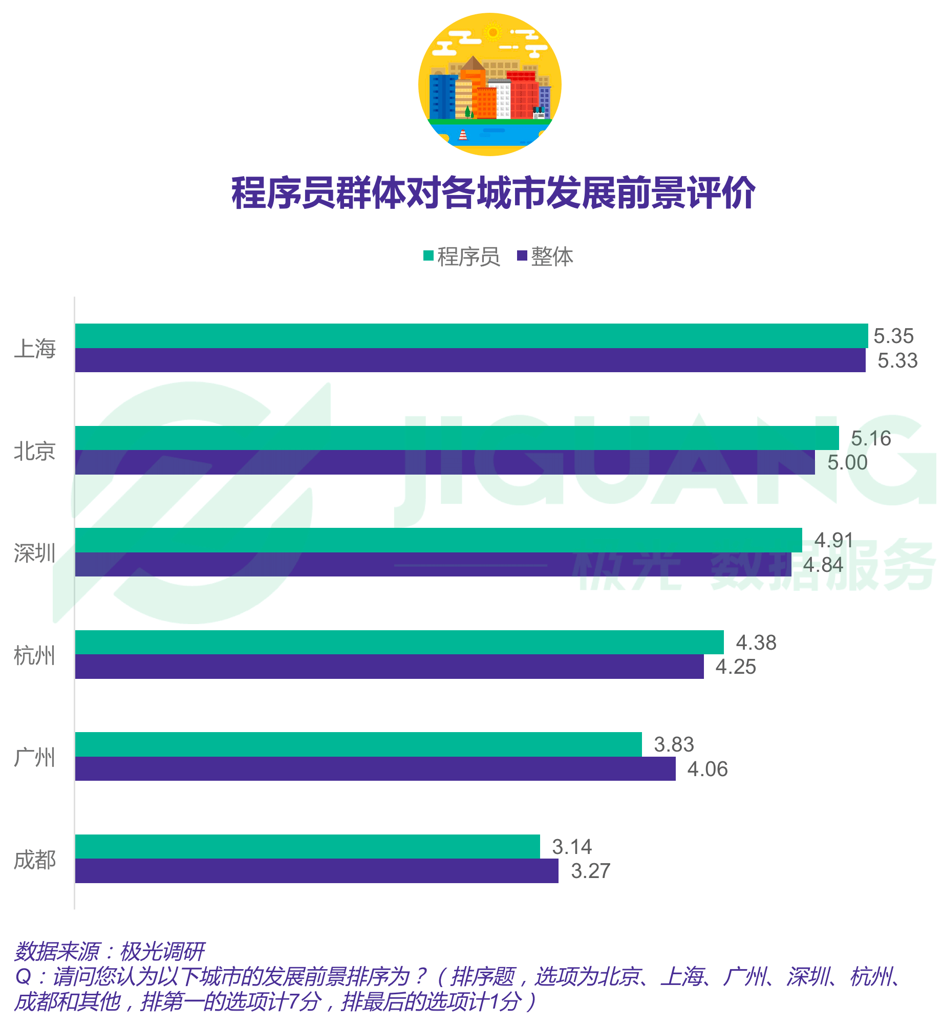 ? 受访程序员群体认为,各主要城市发展前景排序为:上海-北京-深圳-杭州-广州-成都