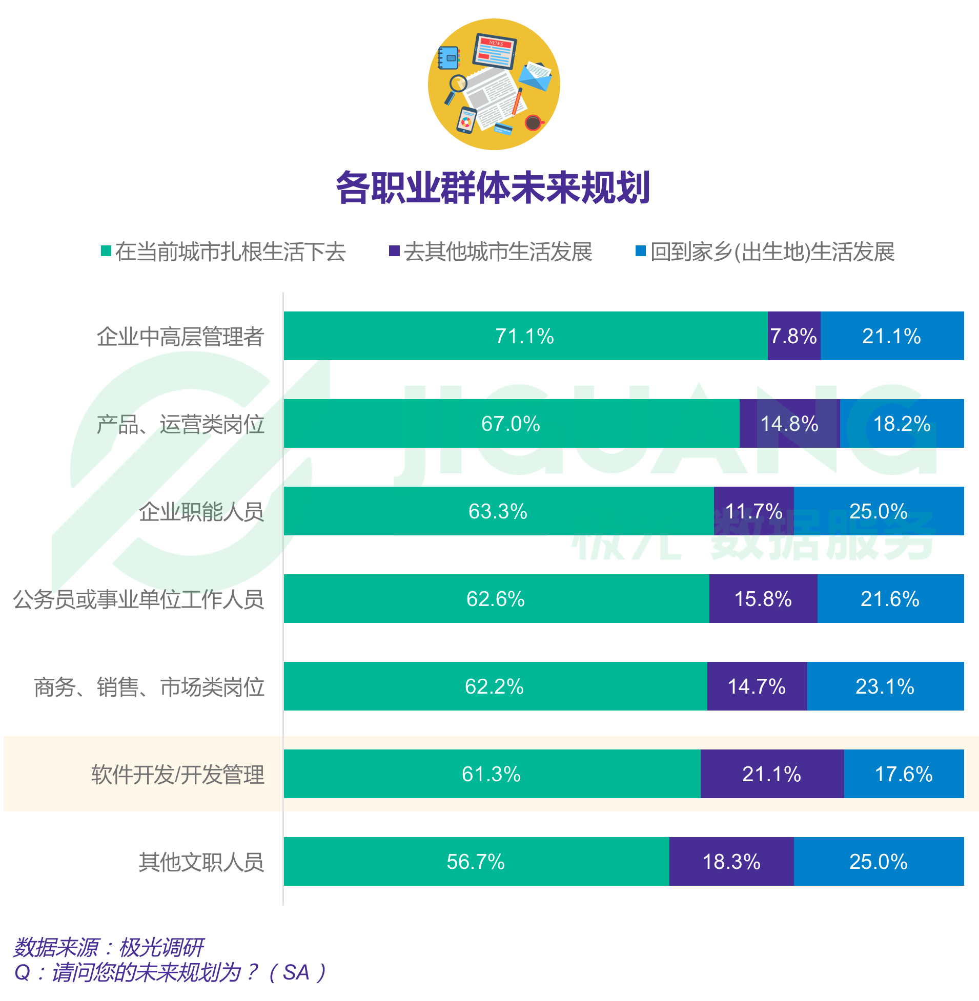在各职业群体中,程序员希望在当前城市扎根的比例并不高