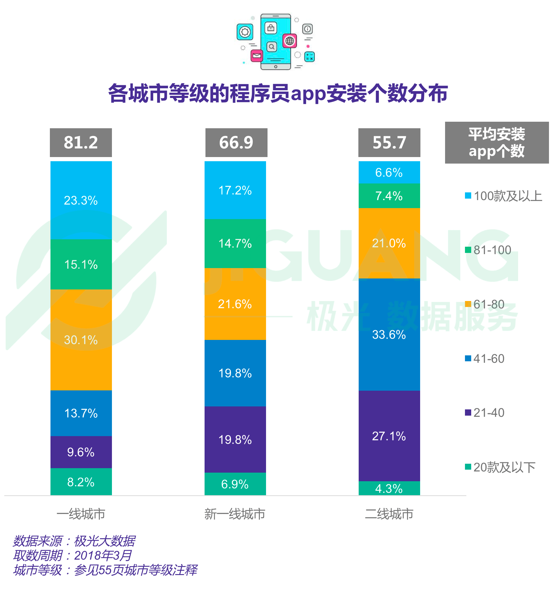 ? 巨能装:一线城市程序员平均安装81.2个app,明显多于新一线和二线城市程序员
