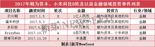 早在2015年,小米便开始布局金融,随后的一年多时间,小米不断扩张金融业务,涉足贷款、保险、理财、支付等多个领域。今年,小米和顺为在物联网金融领域的早期投资共5笔,涉及在农业、智能投顾、民宿众筹等领域。