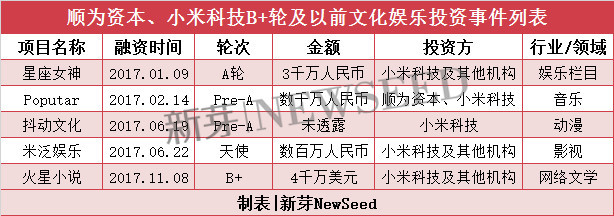 投资泛文化产业显示了雷军向年轻人靠拢的决心。据新芽NewSeed不完全统计,2017年,雷军和他的小米科技、顺为资本在文化娱乐领域共有5笔B+ 轮及以前融资,具体投资事件如下: