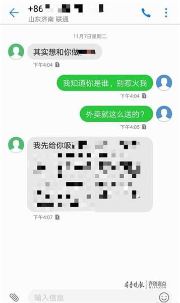 就外卖小哥向女大学生发淫秽短信骚扰一事,22日下午,记者联系到了涉事的外卖平台。平台相关负责人表示, 在接到客户的电话投诉后,他们根据客户订单第一时间找到为其配送的骑手为代理商众包骑手。由于骑手接单电话和 用户收到骚扰短信的电话不一致,无法准确定责,当时代理商公司对骑手进行了警告处理。目前,骑手电话无人接听 ,公司已经暂时对其进行封号,接下来会继续寻找骑手本人核实此事。(原标题:女大学生取消订单遭外卖员骚扰 短信内容淫秽露骨)