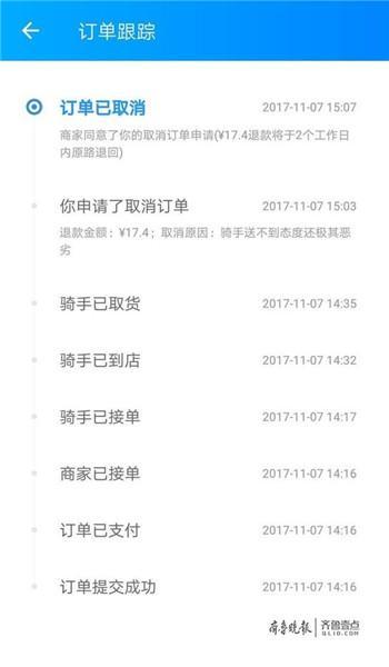 听到小婧要退餐,外卖小哥当时就急了,冲着她大声吼“你就退,你退吧”,随即挂断了电话。无奈之下,小婧又找到了商家,说明事情缘由后,商家也很爽快,立刻取消了订单。在订单取消原因一栏中,小婧写道:“骑手送不到态度还极其恶劣”。