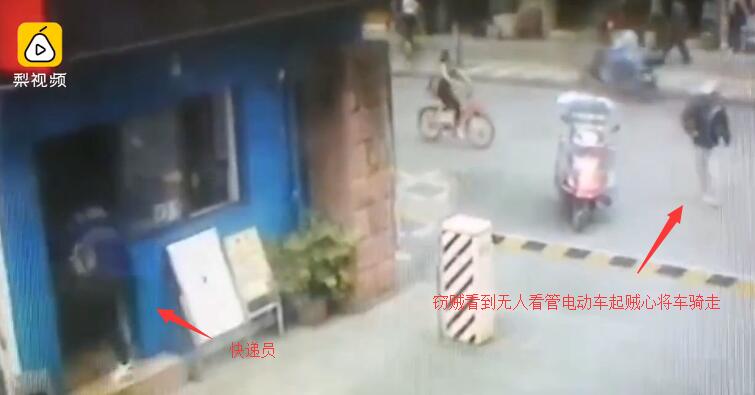 当时快递小哥进小卖部送快递,门外路过的窃贼看到电动车边无人,便动了贼心,将车骑走。