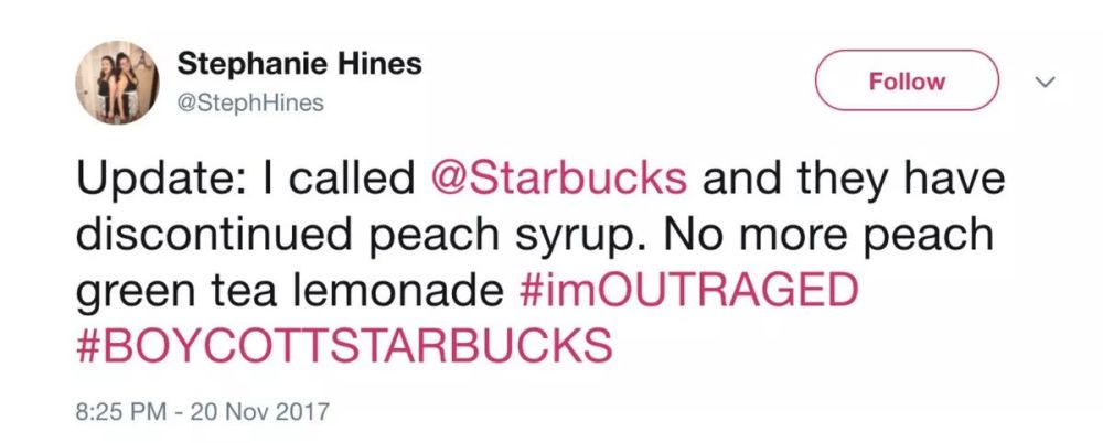 取而代之的是星巴克推出的新品水蜜桃柑橘白茶柠檬水(Peach Citrus White Tea Infusion Lemonade)和菠萝红茶柠檬水(Pineapple Black Tea Infusion Lemonade)。这就引起了广大茶友们的不满,甚至有网友在Twitter上表示要抵制星巴克。