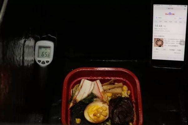 官方测试显示, 外卖进箱前是65 ℃。过了一小时再测试温度,并没有太大的变化 。而一般情况下,外卖小哥可以在35分钟以内把餐送到。