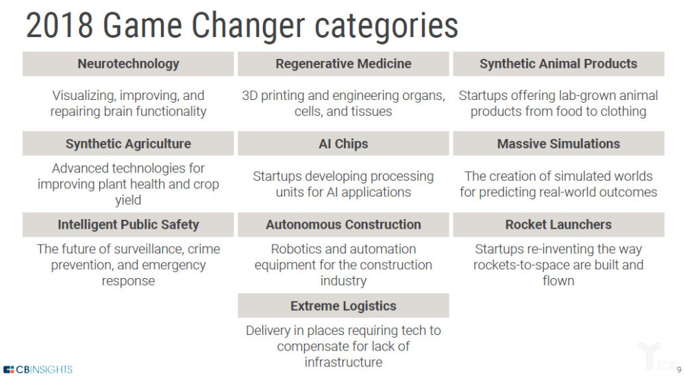 CB insights梳理了2018年30家可以代表最新技术开发与应用的公司,这些公司主要分布于10个领域:神经技术、再生医学、合成动物产品、合成农业、AI芯片、大规模仿真、智能公共安全、建筑自动化、火箭发射和极速物流。