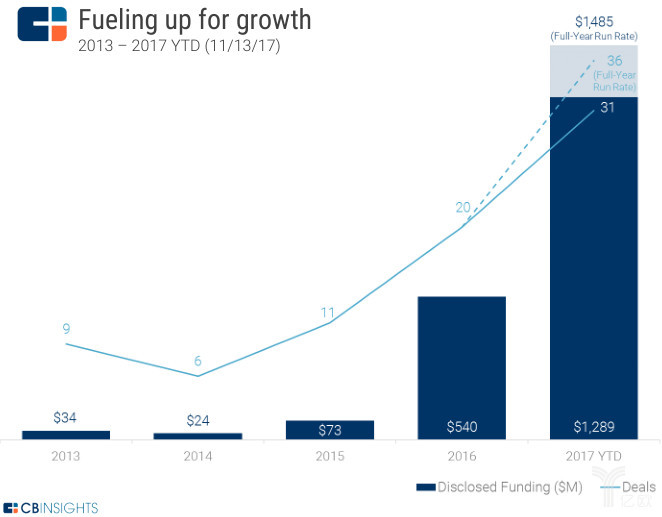 自2013年以来,这30家公司共获得投资77次,累计融资19.6亿美元。2017年截至11月13日,这30家公司共获得31次投资,累计融资1.29亿美元。按照目前的融资速度,这30家公司2017年预计达到36次融资,近1.5亿美元融资额。