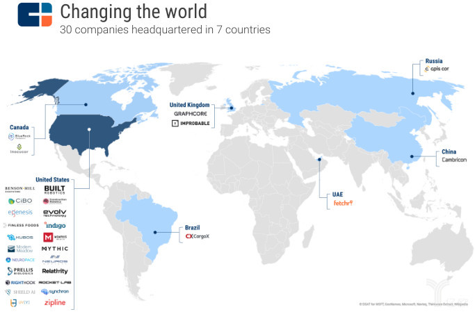 在这30家公司中,22家位于美国,其余8家公司分别位于巴西、加拿大、俄罗斯、阿联酋、英国和中国。中国只有寒武纪一家公司上榜。