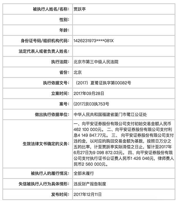 贾跃亭被列入“老赖”名单的案件与平安证券相关,立案时间为9月28日。