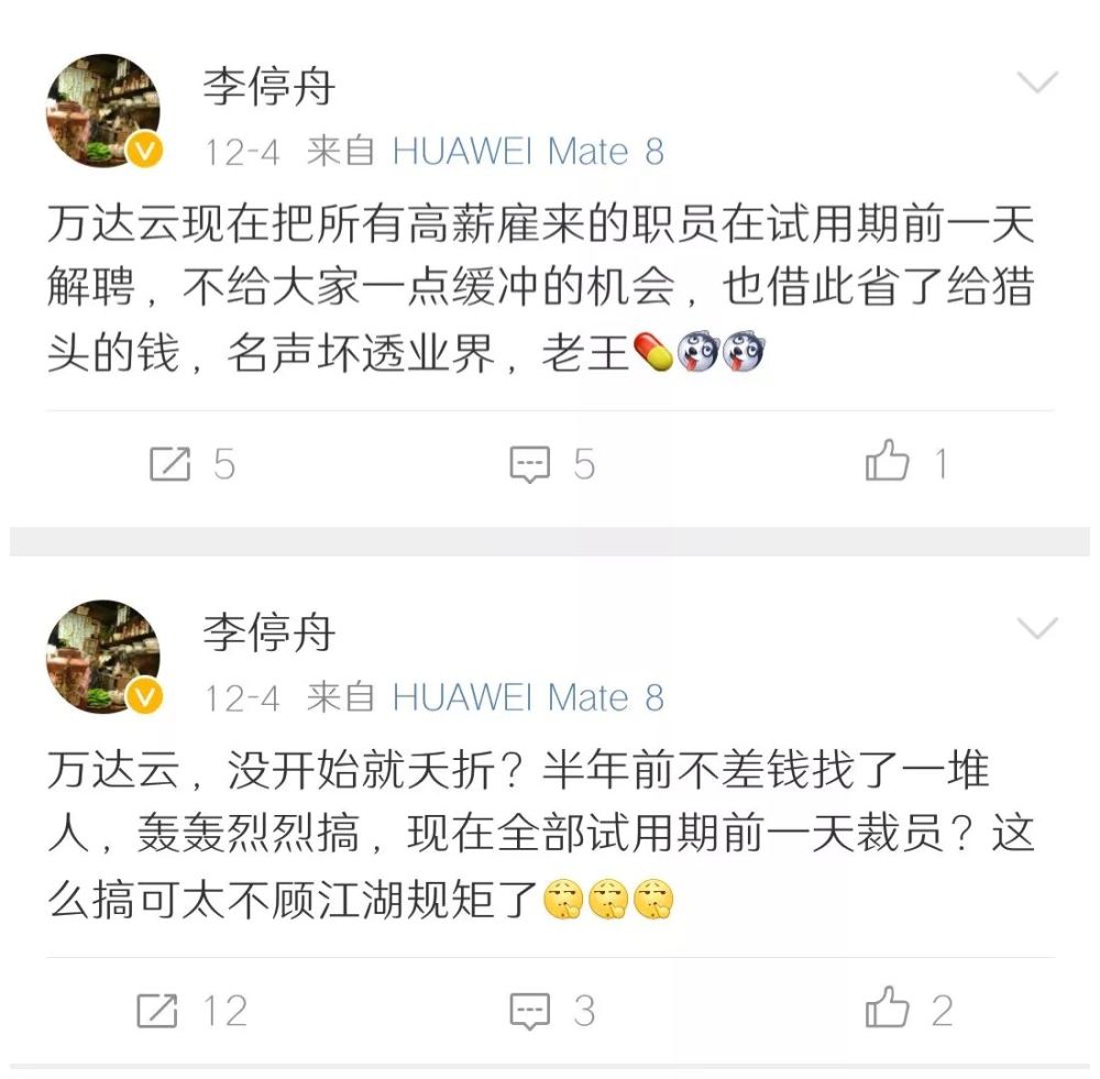此外,在12月初,有微博认证为上海交通大学软件学院副教授的博主@李停舟发布关于万达云的微博,称万达在把所有高薪雇来的职员在试用期前一天解聘。