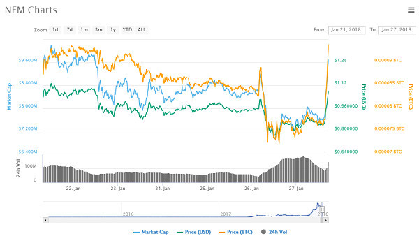 值得注意的是,本次 CoinCheck 交易所被窃事件似乎对新经币价格没有太大影响,在过去的二十四小时里,新经币价格上涨超过30%,最后交易价格为1.11美元(具体可参见下图):