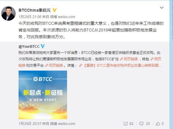 “ 我对BTCC未来的全新篇章感到激动——这次收购将使我们在2018年及今后获得成功。我们将获得新的资源,并且将有新一批经验丰富,才华横溢的高管加入BTCC团队,这将带领我们推动数字资产生态系统各个领域的发展,包括矿池,支付渠道和交易平台业务。”