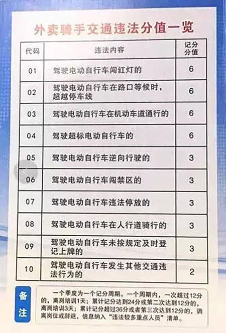 “逆行”记3分、“违停”记3分、“闯红灯”记6分……上海将正式实施全职外送人员记分管理制度,要求全职外送人员随身携带记分卡,对外送人员各类交通违法设置相应扣分值。以一个季度为一个记分周期,记分满12分后,骑手离岗一天;如记满24分,骑手将离岗三天;记分达36分,骑手将直接被外卖企业清退,并进入外卖企业的负面清单。