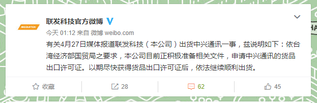 联发科技官方微博发文称,有关4月27日媒体报道联发科技(本公司)出货中兴通讯一事,兹说明如下:依台湾经济部国贸局之要求,本公司目前正积极准备相关文件,申请中兴通讯的货品出口许可证。以期尽快获得货品出口许可证后,依法继续顺利出货。