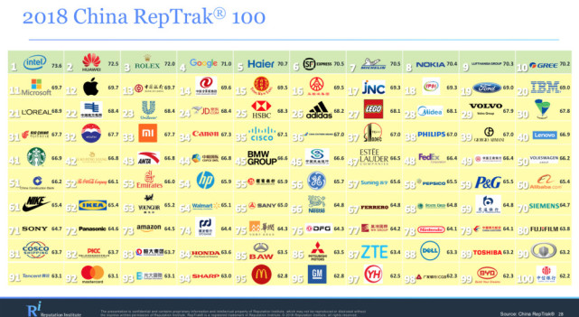 为了收集信息,声誉研究所对280家公司的近3万名中国消费者进行了调查,他们被要求根据信任、尊重、钦佩以及品牌传播等因素对这些公司进行打分,这些分数的平均分就是每个公司的最终声望得分。调查显示,中国消费者显然认为华为比苹果“更真诚”。