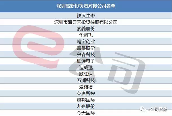 知情人士向证券时报·e公司独家提供的名单显示,深圳高新投首批对接的民营上市公司有16家,包括铁汉生态、索菱股份(6.280, 0.00, 0.00%)、华鹏飞、翰宇药业、雷曼股份(5.030, 0.46, 10.07%)、兴森科技(3.650, 0.13, 3.69%)、证通电子(6.460, 0.00, 0.00%)、迪威尔(4.470, 0.00, 0.00%)、欣旺达(7.990,0.00, 0.00%)、爱施德(5.610, 0.16, 2.94%)、英唐智控、腾邦国际(9.700, 0.00, 0.00%)、九有股份(2.710, 0.25, 10.16%)、齐心集团(7.840, 0.00, 0.00%)、万润科技、今天国际(9.750, 0.00, 0.00%),还有一家系拓维信息(3.780, 0.14, 3.85%)单一第三大股东深圳市海云天投资控股有限公司,共计17家。