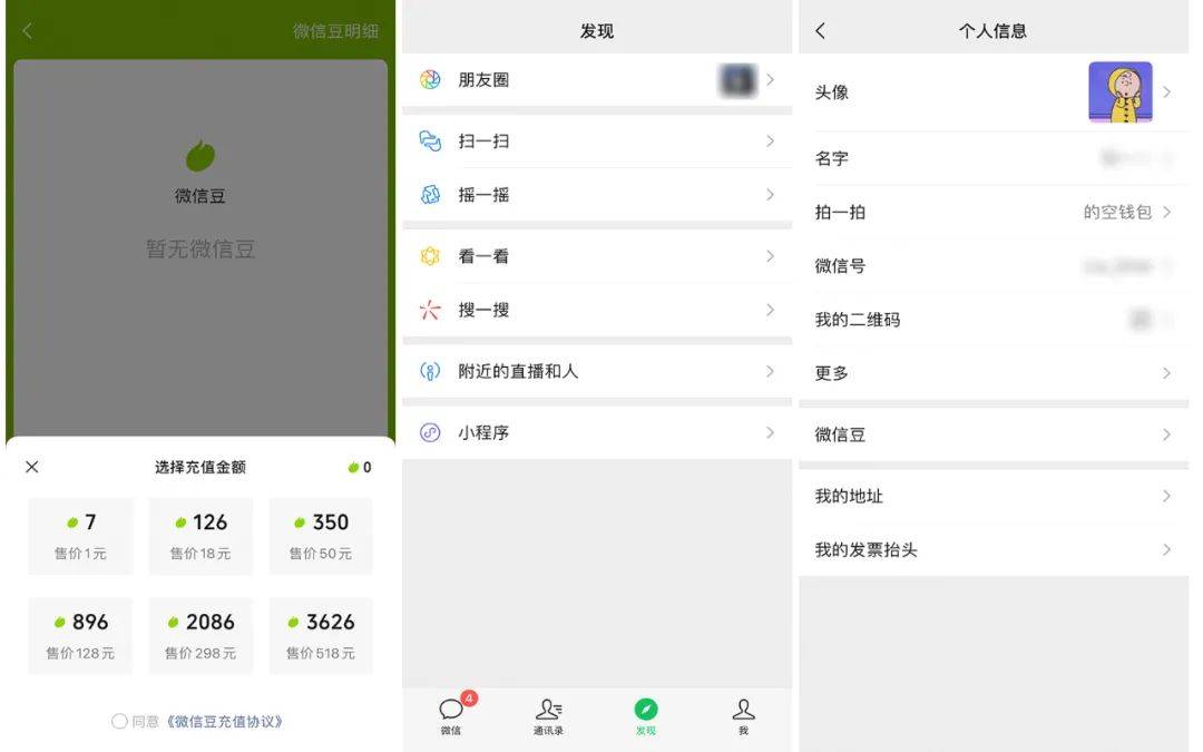 新增了用来支付微信内虚拟人物的「微信豆」、发现「附近的人」改为发现「附近的直播和人」...