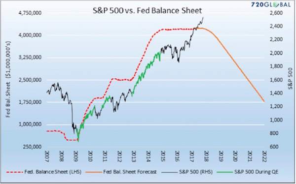这不是有争议的,而是完全有道理。大量低成本流动性的退出,也会对资产价格产生相反的影响。从而使得美联储在进行资产负债平的平衡时,对中小投资者造成巨大损失。有意思的是,美联储甚至给了我们一份时间表,表明它将平衡其资产负债表。迈克尔-莱博维茨教授的图表告诉我们,如果美联储像计划的那样不受影响,如果流动性和股票价格之间的关系持续下去,标准普尔500指数会跌到什么程度。