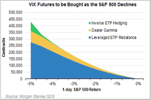 标准普尔500指数单日下跌5%将迫使对冲基金商、交易商和ETP发行商购买超过40万份VIX期货合约。这仅仅是在10月份,此后这个数字可能上升。道格不确定,在这种压力下的市场是否还能够提供这么多的流动性。我怀疑,在这种情况下,各种与波动性指数相关的产品会让买家失望。