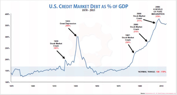图1:1870年-2015年,美国未偿还信贷占GDP比例走势