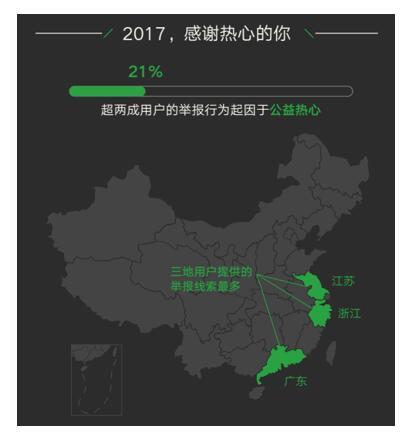 根据微信品牌维权平台数据,2017年有超两成用户的举报行为起因于公益热心,广东、江苏、浙江三地的用户提供的侵权线索数量最多。
