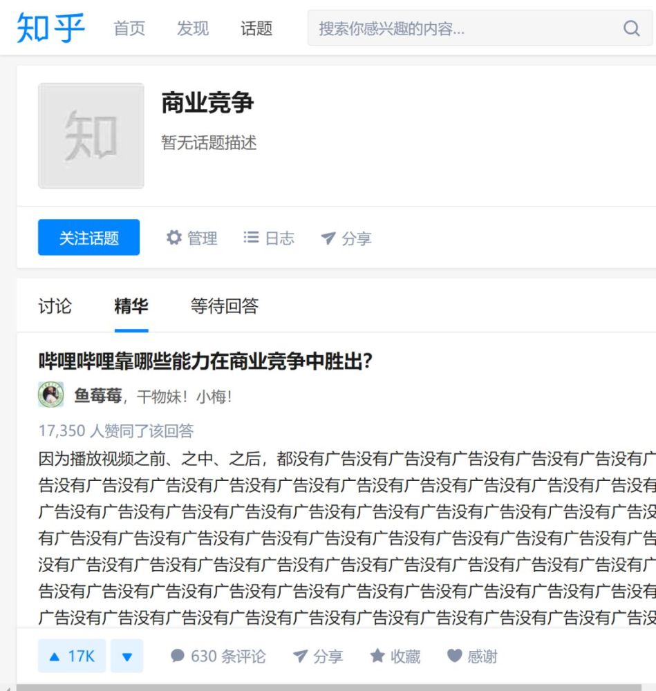 知道知乎上关于“商业竞争”话题最高票的问答是什么吗?“哔哩哔哩靠哪些能力在商业竞争中胜出?”,高票答案用满屏地“没有广告”就轻松收获了上万赞同。这样现象除了说明了用户对于视频广告的极度反感外,更多地是给予B站在视频红海中差异化创新的肯定。