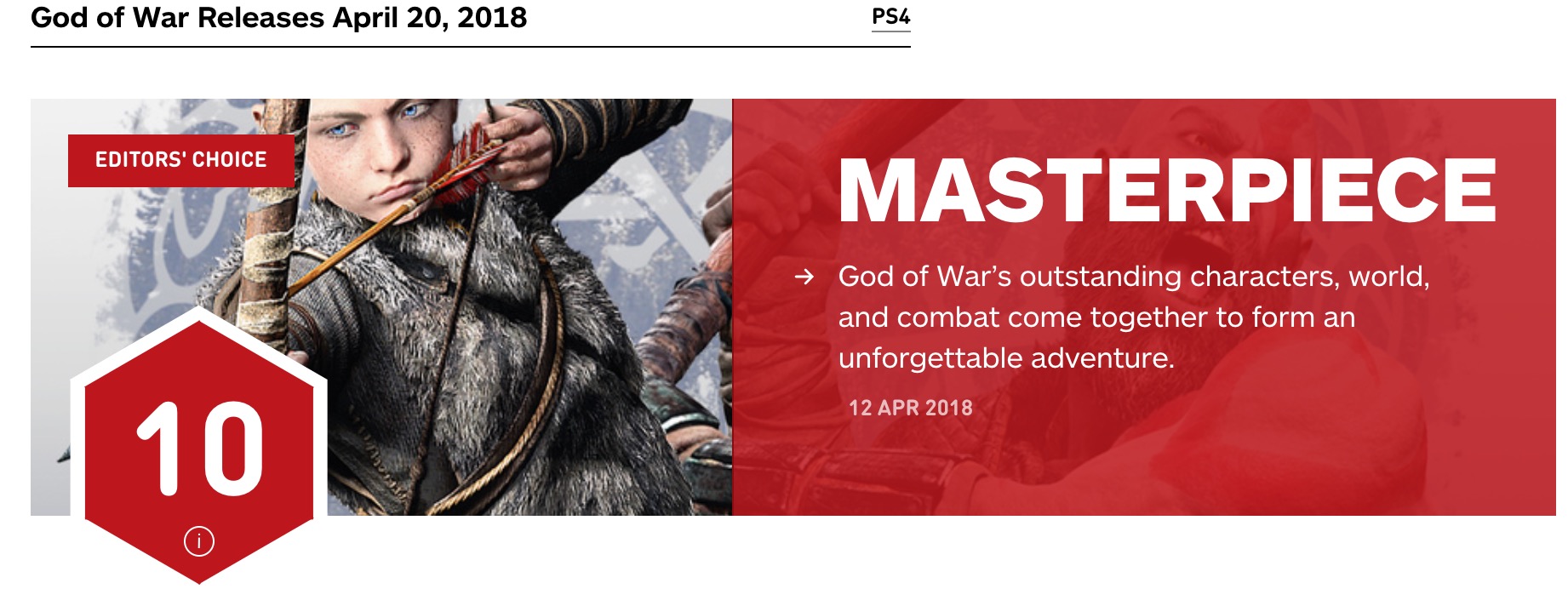 由索尼电脑娱乐发行的动作游戏《战神》在 IGN 、Polygon 、Easy Allies 、Destructoid 、Push Square 、God is a Geek 均获 10 分,网友调侃:奎爷再一次震撼世界的表演。